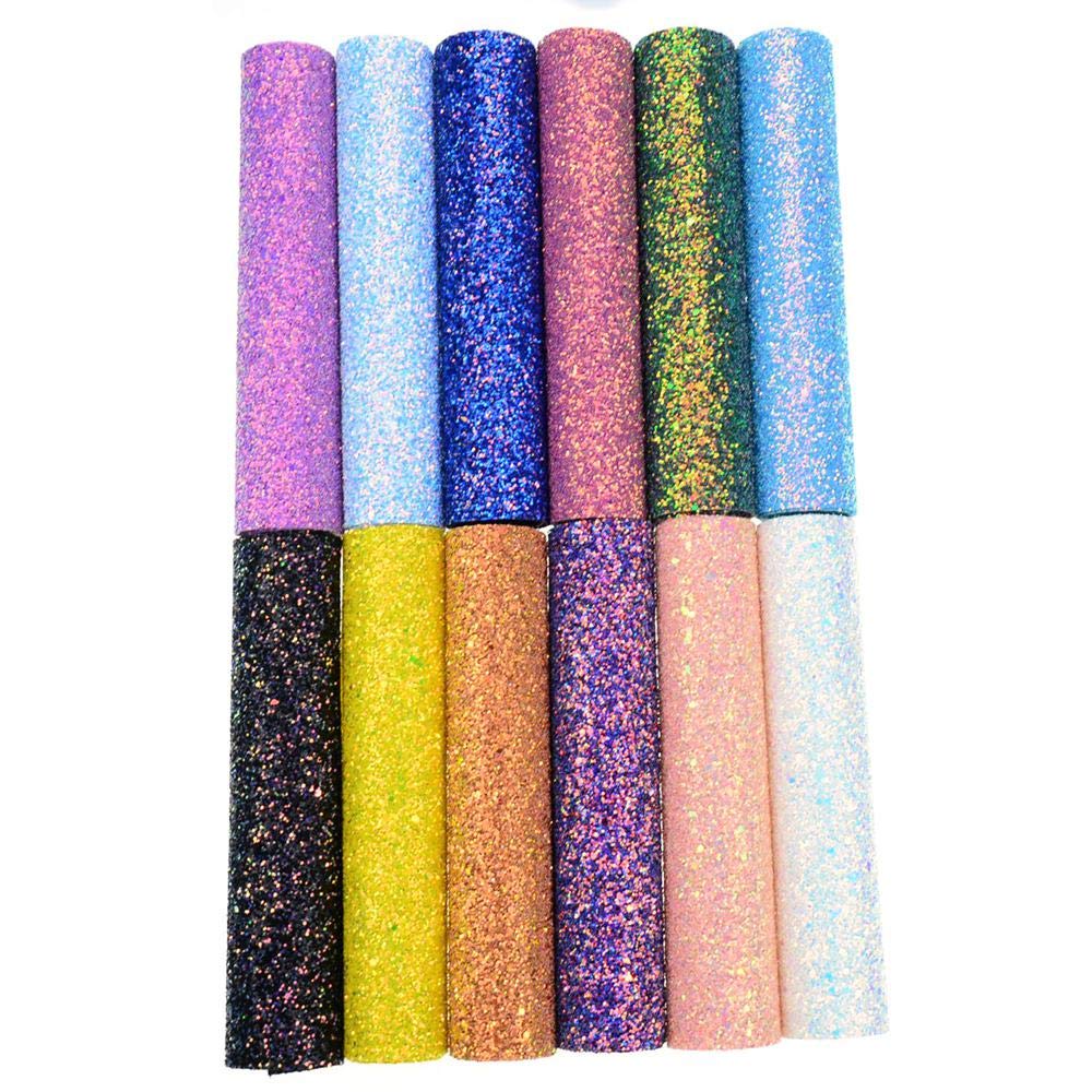 12 Sheets 8" x 12" Solid Color Chunky Glitter Faux Leather Fabric Sheets Thick Canvas Back For Bows Making, Earrings Making, Hair Accessories, Sewing, Patchwork, Each Color One Sheet